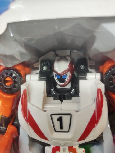 В комплекте: фигурка робота со съёмными элементами-автомобилями в блистере. Цвета деталей: белый/красный/чёрный (торс), оранжевый (руки), синий (ноги).