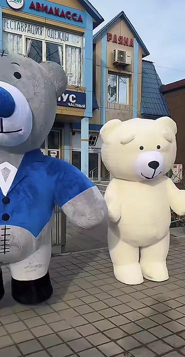 Также на фото виден вариант маскота медведя в синем пиджаке — возможна работа в паре персонажей для усиления промо-эффекта.