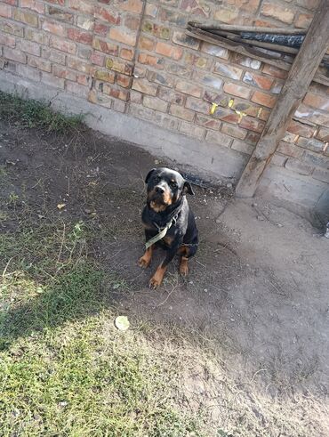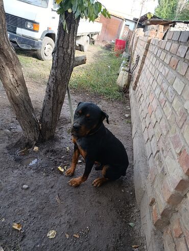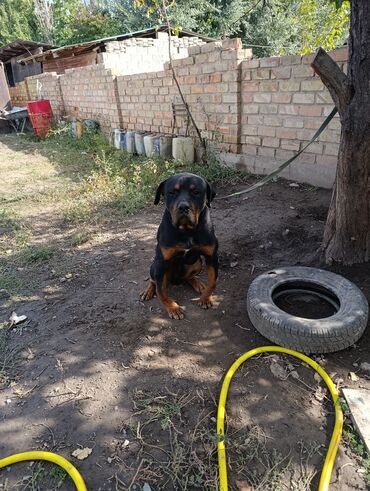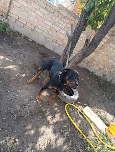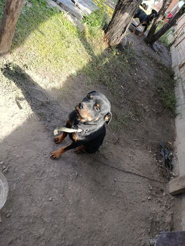 Ротвейлер, кобель. Классический черно-подпалый окрас, мощный костяк, широкая грудь, крепкая шея. Укороченная шерсть, выразительная голова с крупной мордой и темными глазами. На фото собака на ошейн...