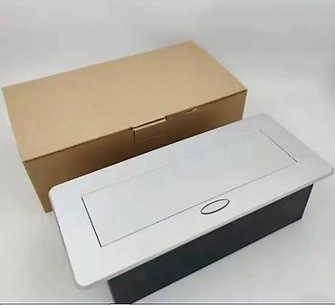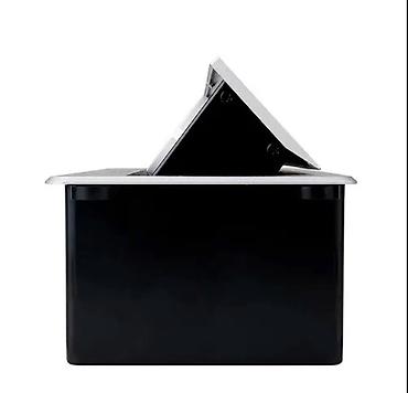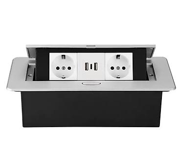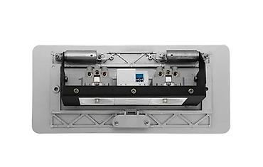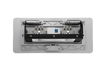 Компактный блок для установки в столешницу, тумбу или подиум. При нажатии на кнопку панель плавно поднимается и открывает доступ к разъемам, в закрытом положении заподлицо с поверхностью.