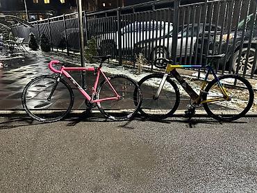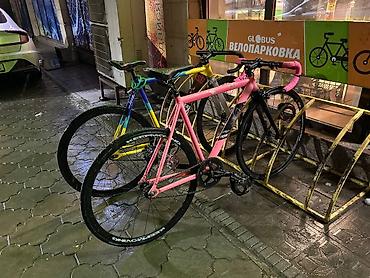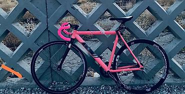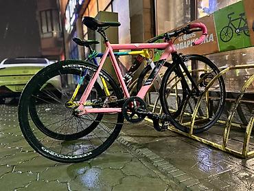 - Рама и вилка: стальная/алюминиевая трековая геометрия, ровные горизонтальные дропауты под фикс/синглспид. Цвет рамы — розовый, вилка — чёрная.