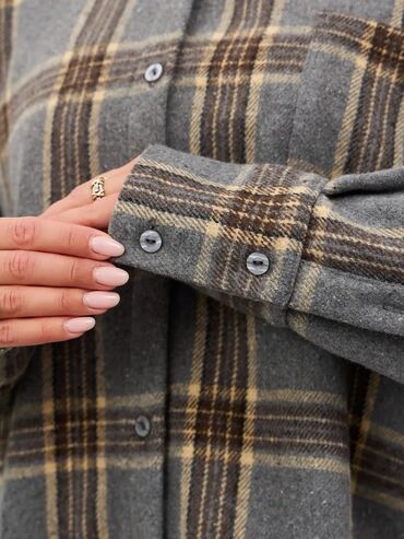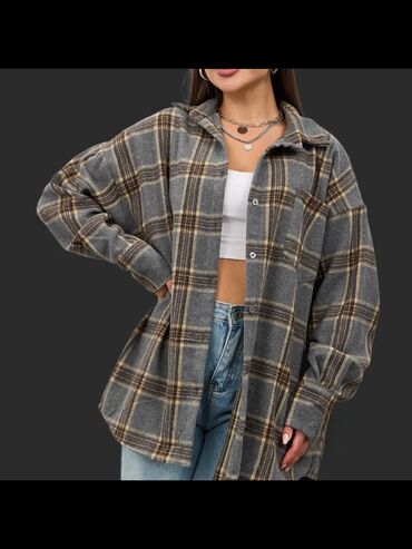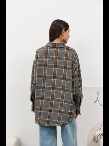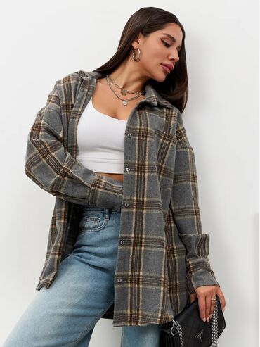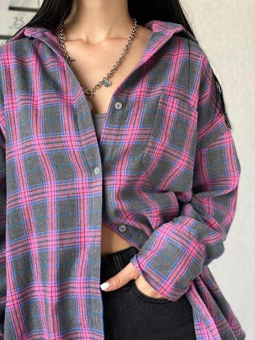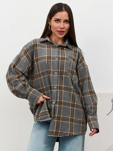 Женская рубашка в крупную клетку, свободного кроя - Силуэт: оверсайз с расслабленной посадкой, удлинённый низ, опущенная линия плеч. - Застёжка: планка на пуговицах по всей длине. - Ворот: отложно...