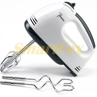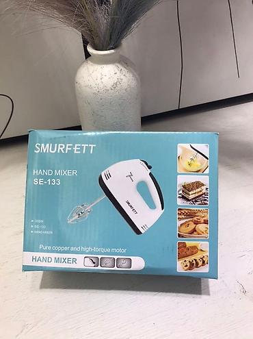 Модель: Hand Mixer SMURFETT SE-133. Цвет: белый/черный. На корпусе переключатель скоростей и кнопка извлечения насадок. Комплектация и характеристики соответствуют изображениям на упаковке.
