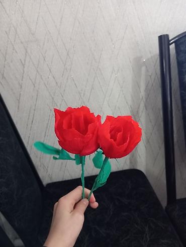 - Материалы: креп-бумага ярко‑красного и зелёного цвета, флористическая проволока/лента для стеблей.