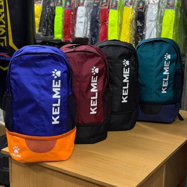- Дизайн: крупный вертикальный логотип KELME и эмблема-лапа; контрастные панели. На фото представлены варианты цветов: бордовый/черный, бирюзовый/синий, полностью черный, синий/оранжевый.