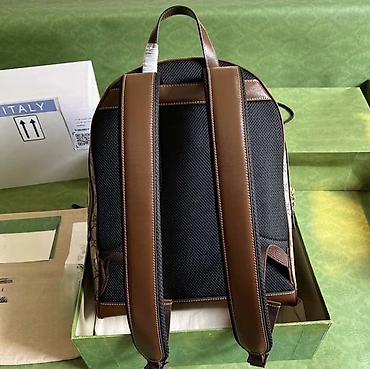 - Материал: фирменное канвас‑полотно с повторяющимся узором GG, контрастная отделка и основание из гладкой коричневой кожи, аккуратная светлая отстрочка.