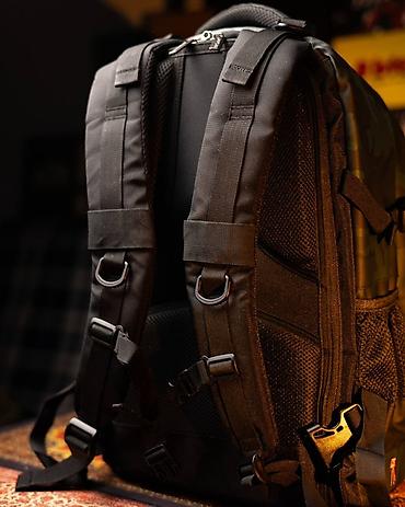 - Отдельная мягкая спинка с вентиляционными вставками и анатомическими лямками; нагрудная стяжка, несколько D-колец для навески.
