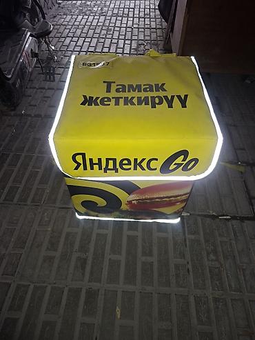 Термо-рюкзак курьерский Яндекс Go для доставки еды. - Формат: жёсткая изотермическая коробка-рюкзак. - Цвет и брендинг: жёлтый с логотипами «Яндекс Go» и надписью «Тамак жеткирүү». - Конструкция: ...