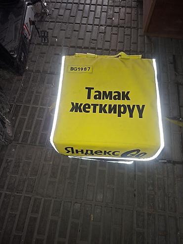 - Яркий жёлтый цвет с крупной надписью «Тамак жеткирүү» и логотипом Яндекс Go; по периметру — светоотражающие ленты для заметности в тёмное время.