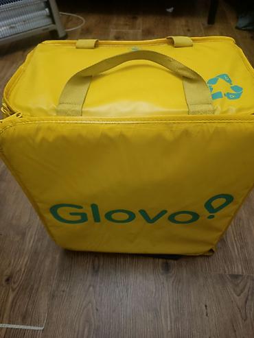 - Цвет: жёлтый с бирюзовой надписью Glovo.