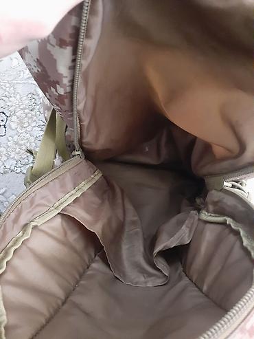 - Материал: синтетическая ткань с водоотталкивающими свойствами по ощущению, ремни — прочная стропа песочного цвета.