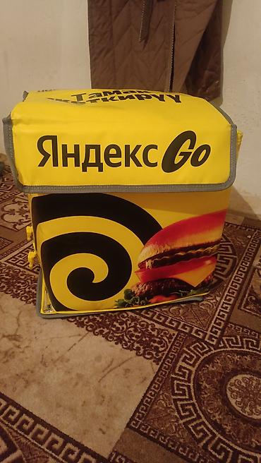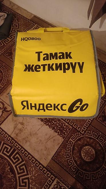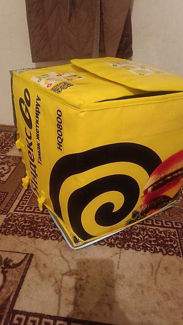 Термо-рюкзак/сумка для доставки еды Яндекс Go. - Формат: короб-рюкзак с жёсткими стенками и клапаном‑крышкой. - Цвет и брендинг: яркий жёлтый с логотипом «Яндекс Go» и надписью «Тамак жеткирүү» (д...