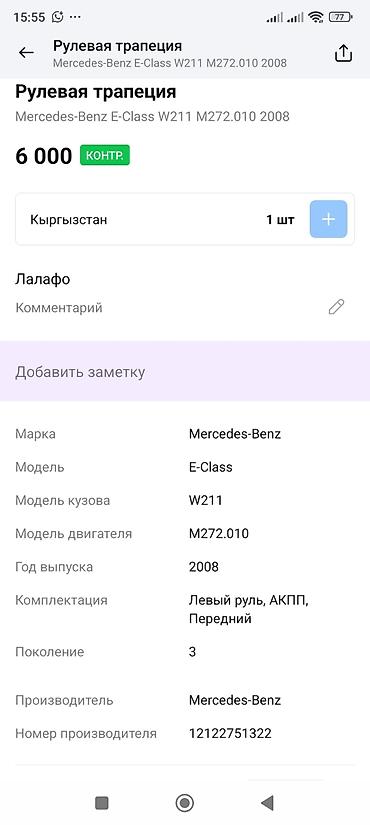 Пожалуйста, сверяйте номер и конфигурацию авто (W211, M272.010, левый руль, АКПП) перед подбором.