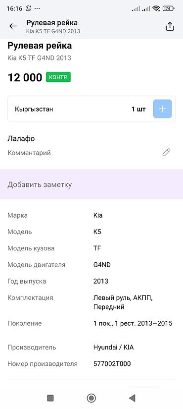 Подходит для замены штатной рейки на автомобилях Kia K5/Optima TF указанных лет и комплектаций. Рекомендуется сверять номер OEM и конфигурацию креплений/тяг со своей деталью перед установкой.