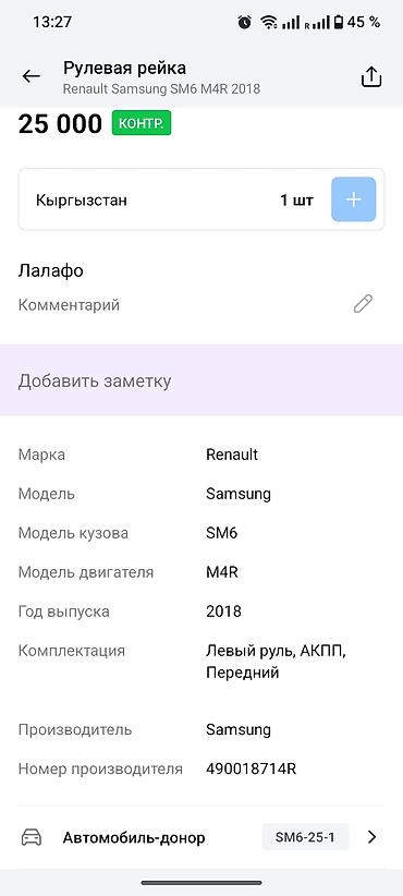 - Renault Samsung SM6 (SM6-25-1) 2018 г. с мотором M4R, LHD, передний привод, АКПП