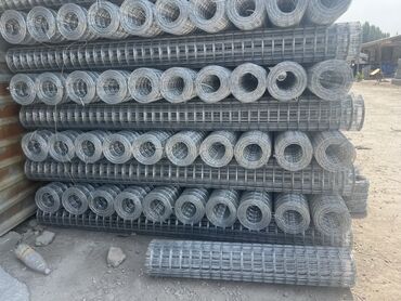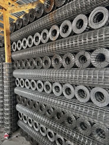 Рулоны проволочной сетки с квадратными ячейками, представленные в различных размерах. Сетка изготовлена из прутьев, сваренных в местах пересечения. Каждый рулон плотно скручен для удобства транспор...