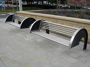 - Современный уличный дизайн: дугообразные боковые опоры и продольные металлические ламели сиденья и спинки.
