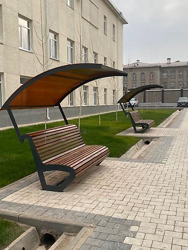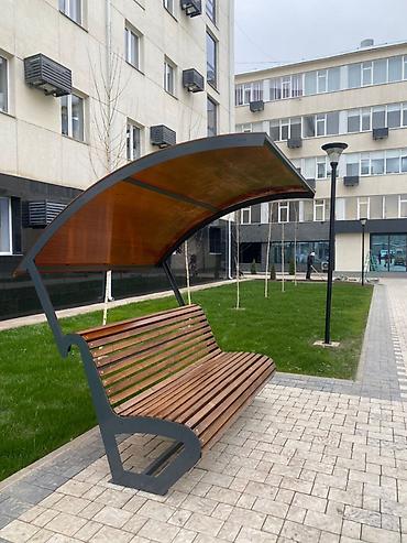- Уличная скамья с интегрированным купольным навесом для защиты от солнца и осадков.