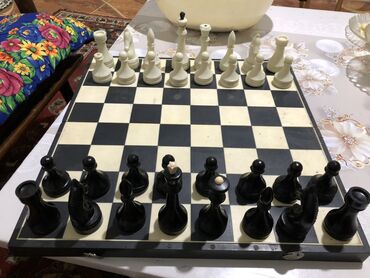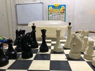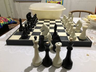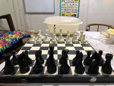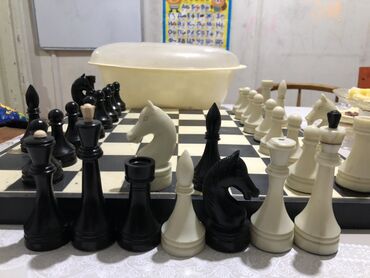 - Классический шахматный комплект: черно-белая доска и полный набор фигур двух цветов (черные и белые).