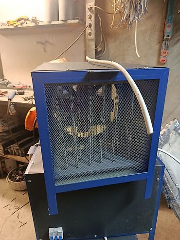 Электрическая тепловая пушка (самодельная/кастом). Компактный напольный агрегат в металлическом корпусе с защитной решёткой.