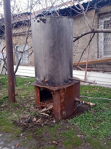 - Конструкция: нижняя топка из металла с колосником и дверцей; сверху — вертикальный цилиндрический бак большого объёма с центральной дымовой трубой (теплообмен через внутренний канал).