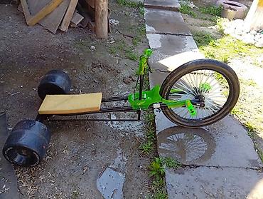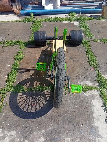 - Конфигурация: одно переднее велосипедное колесо с педалями + широкая сдвоенная задняя ось с большими слик‑колёсами для контролируемого заноса.