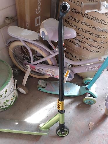 Трюковой самокат - Материал: металлическая рама и вилка,усиленная дека прямоугольного профиля с накладкой griptape. - Руль Т-образной формы, широкая перекладина; грипсы зелёные, рельефные для увер...