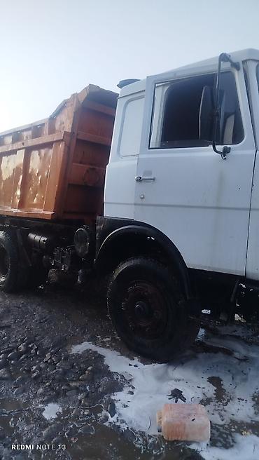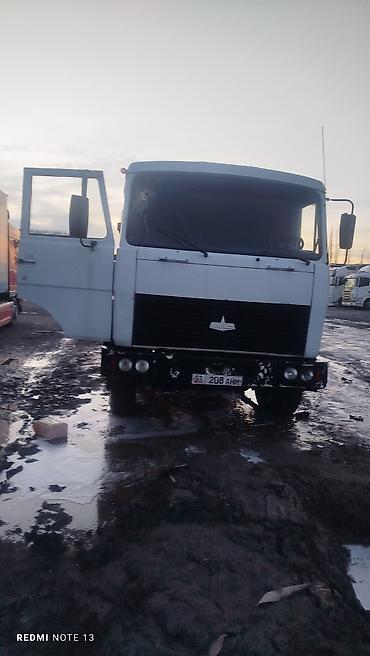 - Классический трёхосный самосвал МАЗ с металлическим кузовом оранжевого цвета, задняя разгрузка.