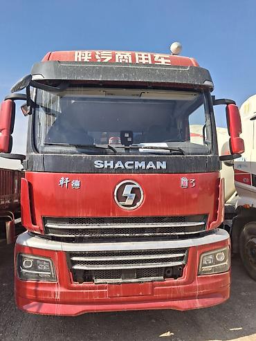 Марка на кабине: SHACMAN; внешнее оформление — красная кабина, тёмный кузов с светоотражающими кантами.