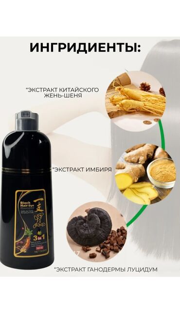 Шампунь-краска для волос в черном цвете. Благодаря натуральным компонентам, таким как экстракты китайского женьшеня, имбиря и ганодермы луцидум, шампунь не только окрашивает волосы, но и питает их, придавая блеск. Подходит для частого использования, не окрашивает кожу головы.
