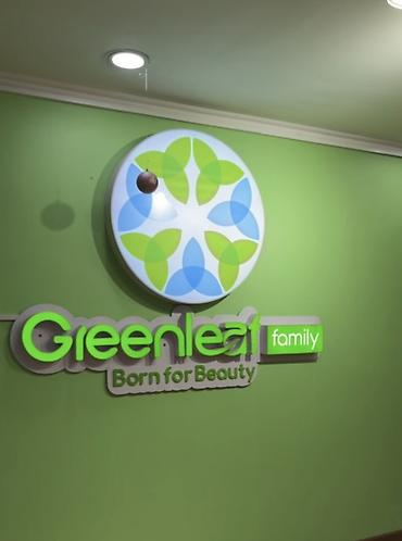 Брендовая витрина Greenleaf family (Born for Beauty). На полке представлены также сопутствующие средства по уходу.