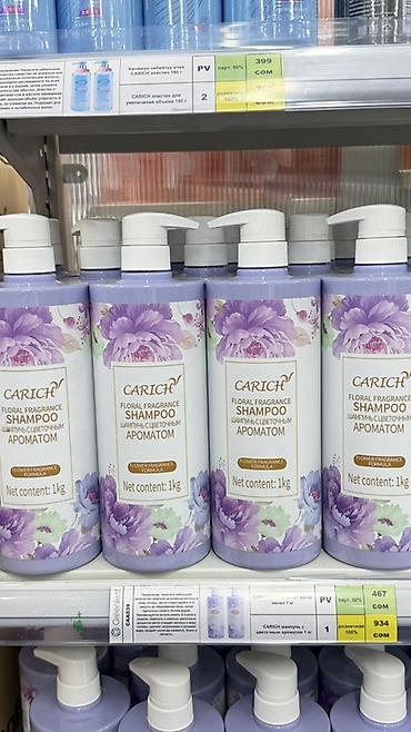 2) CARICH Floral Fragrance, 1 кг — шампунь с цветочным ароматом. Бережно очищает, придает свежесть и легкость волосам. Удобный дозатор-помпа.