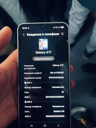 Samsung Galaxy A17 (модель SM-A175F/DS) Основные характеристики: - Память: 4 ГБ ОЗУ, 128 ГБ встроенной памяти (доступно около 100,9 ГБ), поддержка карт памяти microSD - Две SIM-карты (Dual SIM) - ...