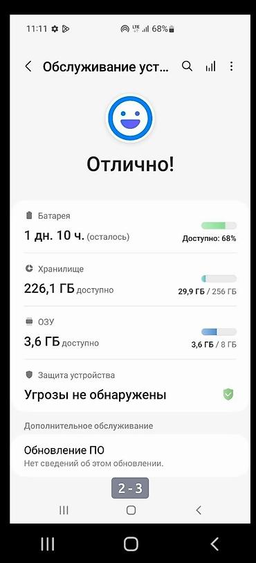 - ПО: раздел «Обслуживание устройства» — угроз не обнаружено; экран с One UI.