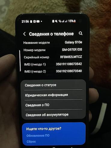 - В меню указана модель: Galaxy S10e, номер модели SM‑G970F/DS, серийный номер и IMEI отображаются на экране.