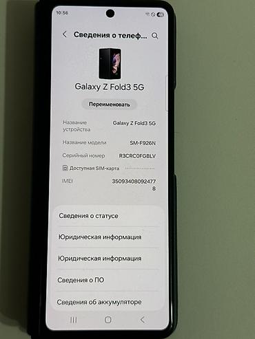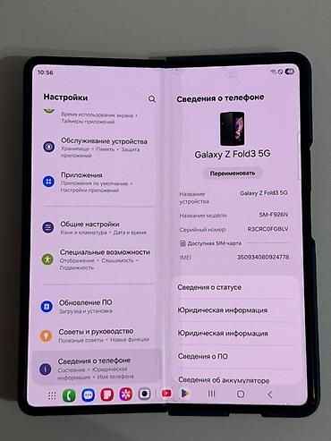 - One UI на базе Android; в меню «Сведения о телефоне» отображается Galaxy Z Fold3 5G, модель SM‑F926N, доступна SIM‑карта, показан IMEI.