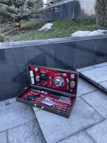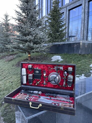 В комплекте также все нужное на природе-нож кизлярский,чехол на нож,тяпка для мяса,термос,фляжка,зажигалка,походный мангал,штопр