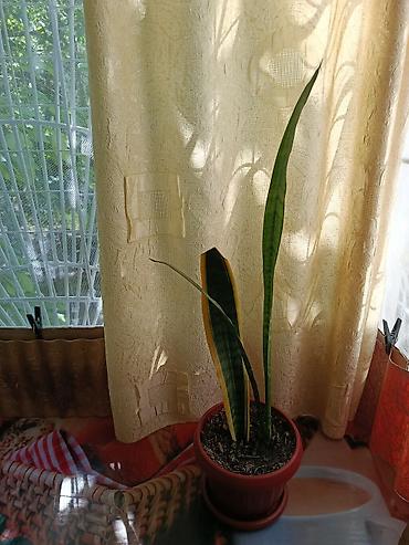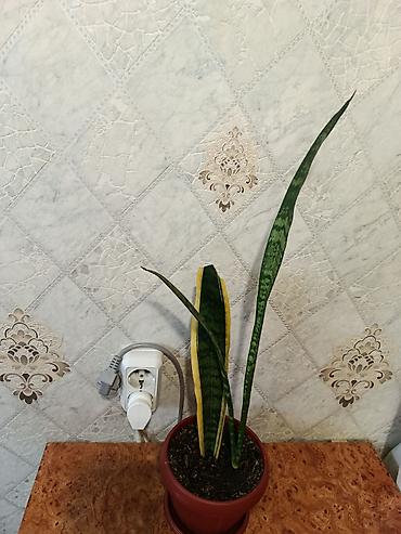 - Сорт: вероятно laurentii — вытянутые мечевидные листья с поперечными зелёными полосами, у одного листа выражная жёлтая кайма.