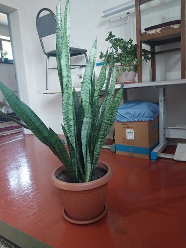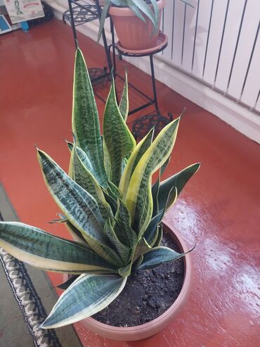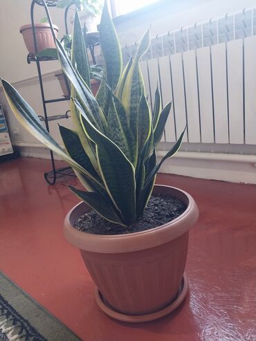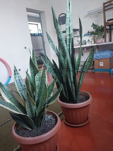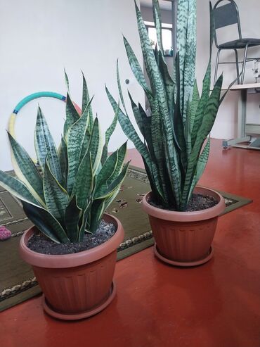 - Два взрослых растения сансевиерии: один сорт с жёлтой каймой на листьях (лауренти), второй – зелёный с характерным мраморным рисунком.