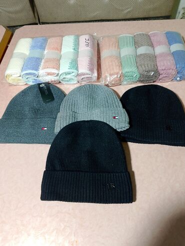Набор товаров для дома и одежды - Трикотажные шапки-бини: однотонные, с отворотом, мелкая вертикальная резинка. Цвета на фото — серый, графит, чёрный. Небольшие нашивки-логотипы, мягкая эластичная...