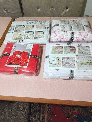 - Комплекты постельного белья: несколько расцветок (цветочные, графичные, однотонные с принтом), каждый комплект в фирменной упаковке с фото-композицией. Ткань – плотный смешанный или хлопковый материал (по виду каталогов), рассчитано на стандартные наборы.