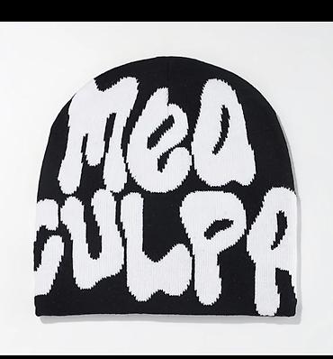 - Черно-белый дизайн: с одной стороны крупный жаккардовый логотип «Mea Culpa», с другой — графичный скриптовый принт со звездами.