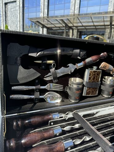 Набор инструментов для барбекю в кейсе с тиснением под кожу. В комплекте представлены шампуры с деревянными ручками, топор с деревянной рукоятью, нож, четыре металлические стопки, зажигалка, фляж...
