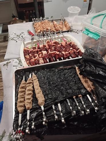 - Виды: классический шашлык из свинины и говядины, куриные крылья в маринаде, люля-кебаб