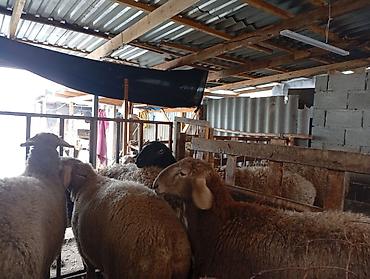 Овцы - Количество на фото: 3 голов. - Окрас: белые, чёрные и тёмно-коричневые особи. - Порода/тип: мясо-шерстные овцы смешанного окраса - Содержание: держатся в крытом загоне. - Подходят для: раз...