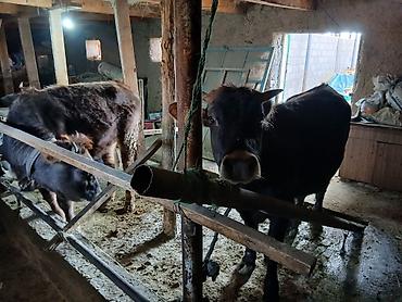 Продаются молодые бычки/тёлки мясо‑молочного направления (на фото — темномастные, рогатые). Содержатся в стойле, приучены к привязи и грубым кормам. Подходят для откорма, домашнего содержания или формирования стада.