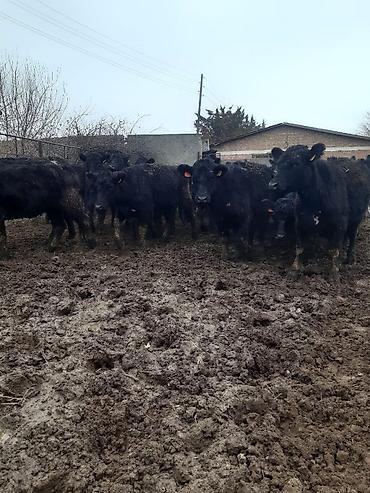 Телята мясного направления - Группа телят, содержатся в крытом помещении на привязи у кормушки. - Окрас разный: чёрный, бурый, светло‑рыжий. - Возраст по виду — молодняк, активные, упитанные. - Уш...