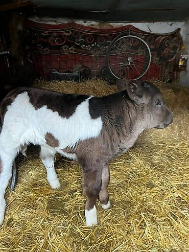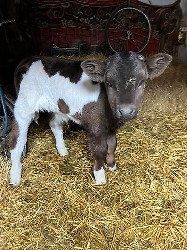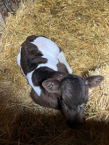 - Молодой телёнок с контрастным чёрно-белым окрасом (тёмно-коричневые/чёрные участки с белыми пятнами).