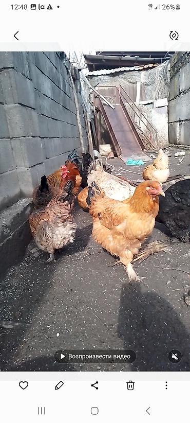 Куры домашние, разного окраса (рыжие, черные, пестрые), вместе с петухом. Порода смешанная, крупная, мясо-яичного направления.