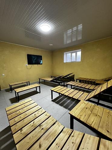 - Комната отдыха с деревянными лежаками и телевизором.